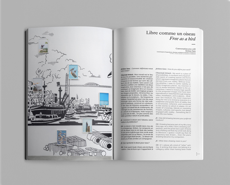 For the Drawing Lab, Chourouk Hriech unfurls a metaphorical locality that links Bangkok to Casablanca and Tokyo to Marseille, a city-world whose main inhabitants are birds. The artist's kaleidoscopic images mix and collide in the exhibition space that is entirely taken over by black-and-white drawings on paper of various sizes as well as on an entire wall, and in immersive installations and videos. This abundant path encourages reverie and exploration, as well as a bodily and intellectual experience of the venue’s physical space, transformed into a "new environment". The animal, including human, and plant kingdoms meld into strata of cities and nature.