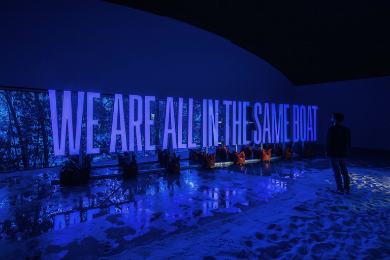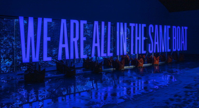 We are all in the same boat, SUPERFLEX, Exhibition view, Desert Flood, Lago Algo, Mexico, 2023 © Ramiro Chaves
