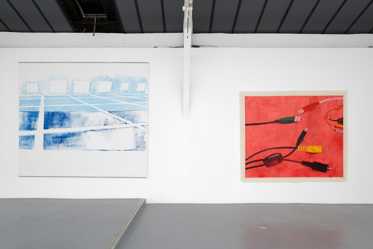The Floating Studio is designed as a real stage on which the ubiquity and velocity of digital technology become an experience to be lived. Miltos Manetas, who has made a name for himself painting the iconographic system of our time—laptops, cables, and all manner of technological devices—presents a set of canvases and wall paintings, Pictures of Manetas Floating Studio. Made from pigments and soap, they can be erased as fast as our online searches, transforming themselves into simulated screens. His analogical representations of the metaverse (a digital duplicate of the physical world, accessible via Internet) scroll across the walls, extending his illustrative project of this concept initiated in 1998 on Active Worlds and later transplanted on Second Life. Everything concurs here to put into play an analog simulation in real time of the digital activity of the computer, and by extension, of the digitalization of the world today. From then on, the changes that modify the works occur in front of the public in response to their questions and reactions. This interactive performance extends throughout the duration of the exhibition, like on a WhatsApp chat, constantly growing, while the unlimited energies of NFTs, social networks, online forums, GAFAs and digital startups flow through this environment. This way, the artist summons our unanimous state of confusion towards the experience of reality, itself constructed and perceived through the prism of the GAFAs (Google, Alibaba, Netflix, Twitter Apple, Facebook, LinkedIn, …). Thus, the project brings with full force the intrusive and immersive nature of the Internet, this inextricable network at the heart of our daily lives.