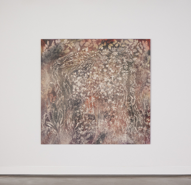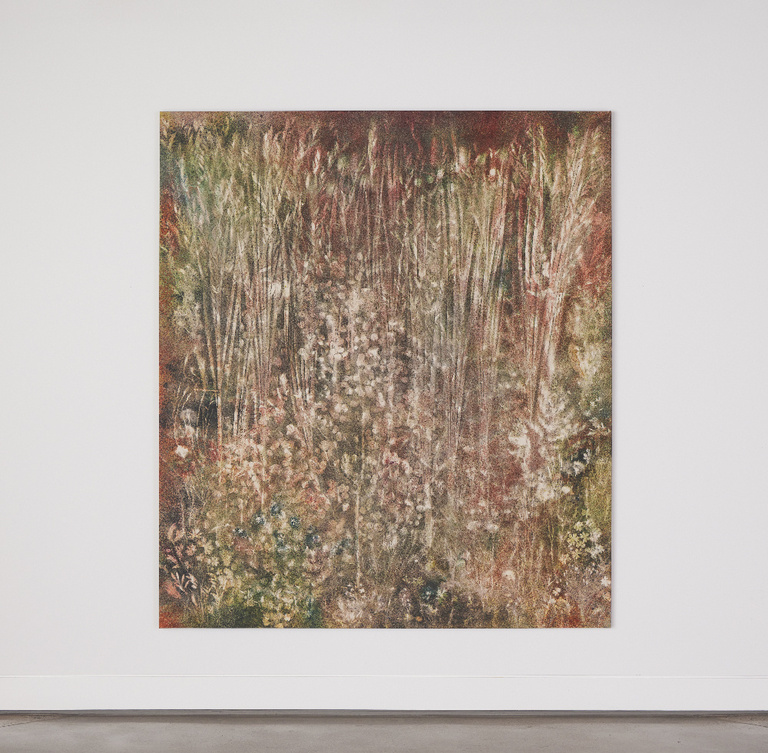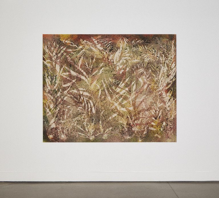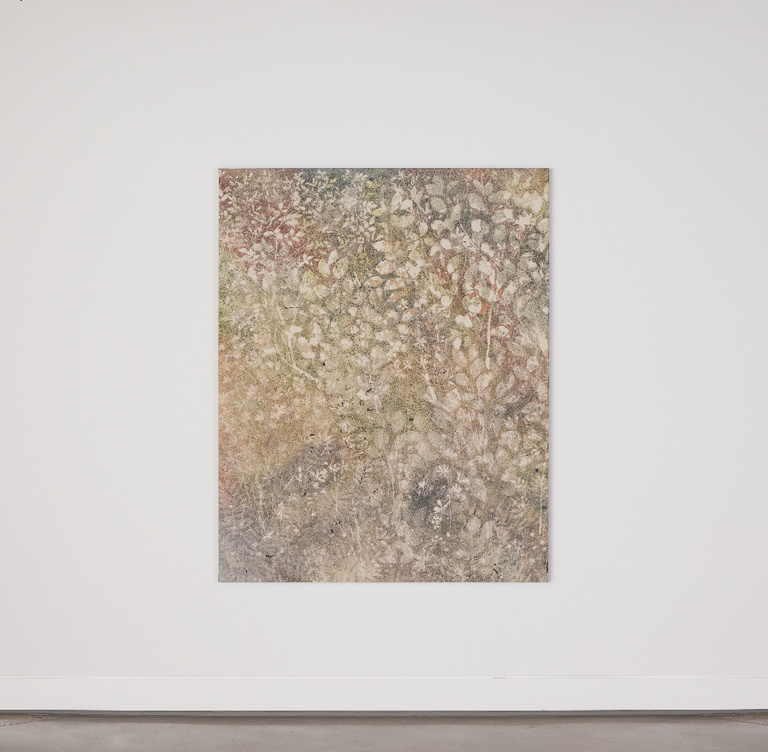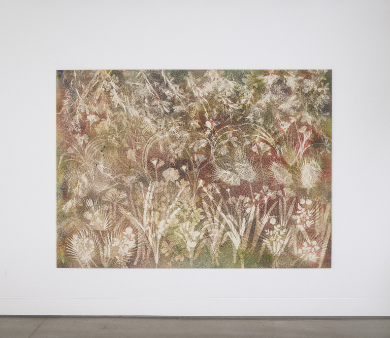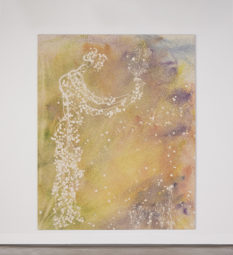 Known for integrating nature in his creative process, Sam Falls sprinkles pigment around plant life that he exposes to atmospheric moisture, sunshine and rain. Nature is Sam Fall’s laboratory that dictates the final result of his works, a studio with no walls. Akin to a kiln for ceramists, his method means never knowing in advance, always embracing the unpredictable forces of the environment. It’s about admitting risk, accepting that things might not work out. The artist operates a reversal: it's no longer us looking at nature, but nature looking at us; no longer humanity taming nature, but nature taming humanity. Nature’s process is respected, an osmosis with space and meteorological time created. Sam Falls’ canvases tell the story of acceptance. No longer is the artist the central actor in the narrative, nature takes center stage, its voice the one heard. Completely forgotten by the post-industrial world, Mother Nature is somehow restored its rightful place.