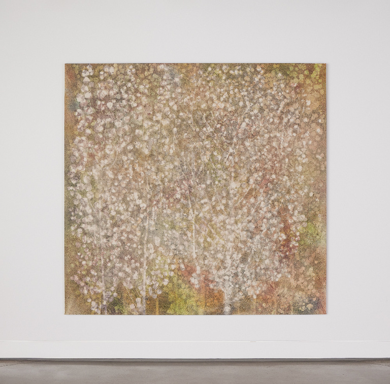 Sam Falls’ works are tinged with a special kind of melancholy, one that resides in finding oneself, of seeking one’s own place in the world. In this quest, Sam Falls tries to reinstate nature in its rightful place, initiating a conversation all humanity must have with the earth in today’s world. Facing Sam Falls’ works, no longer can one pretend to be masters of nature. Nature decides, speaks and demands being listened to. His vertical forest is also a nod to the interior forests that inhabit all of us, the ones that humankind has to remember to look after, to grow and preserve. Both external and internal, these forests have no boundaries, no limits. Unlike humanity that has kept setting borders, defining repeated frontiers over the course of its existence, the forest is just like the sky above our heads that unites us all. It is the quintessential image of unconfined movement, nature unbound, our common ground, and freedom.