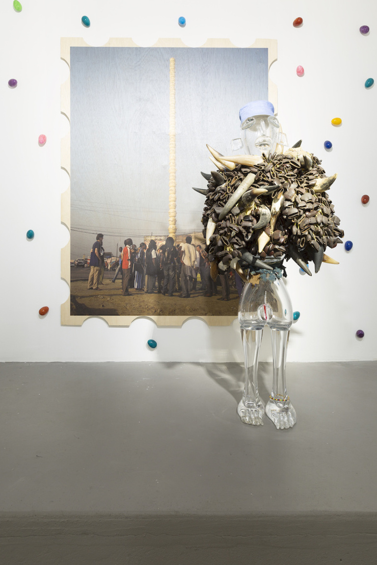 Pascale Marthine Tayou, Postcard 5 Sept 3075, 2018. Print on wood, 159,7 x 121,9 cm; Sauveteur, 2016, crystal and mixed media, 130 x 52,1 x 61 cm, unique work. Exhibition view: Colorful Line, 2018 © Richard Taittinger Gallery, New York © Photo: Shark Senesac