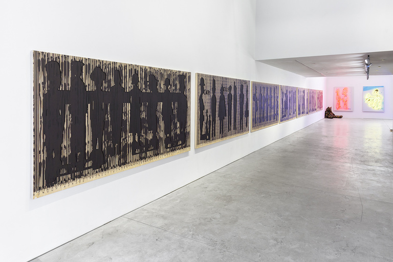 The title comments on the continuing problem of racial discrimination in the United States and of these cultural associations as well as the reference of color, something that crosses throughout Tayou’s work; “Color Line” was originally used as a reference to the racial segregation after the abolition of slavery. Tayou acknowledges this past and present in the monumental, seven-panel work titled Code Noir, newly produced for this exhibition. At about 70 feet in length, the panels show the silhouettes of people painted black, with a black barcode printed on top of them. This alludes to both the “Code Noir”, or slave code, which was a decree originally passed by France’s King Louis XIV in 1685 defining the conditions of slavery in the French colonial empire, and the Black Codes passed by the Southern states in the United States in 1865 and 1866 after the American Civil War, restricting African Americans’ freedom.