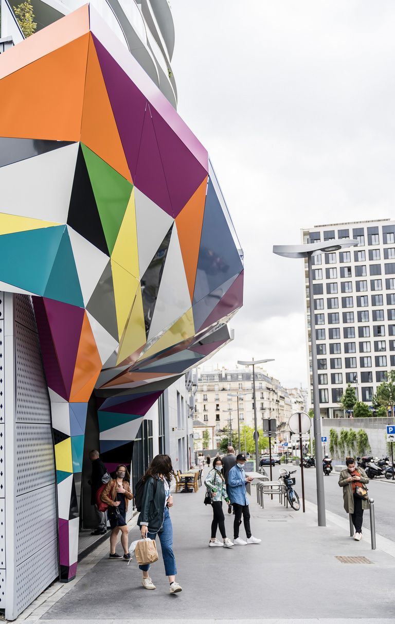 Following an artistic commission curated by Jérôme Sans, the Frankfurt-based op-artist Tobias Rehberger has been commissioned to design the entrance to the new Pont Cardinet metro station on line 14, due to open in 2019 in the Batignolles area. The work takes its inspiration from Hector Guimard’s Art Nouveau originals and features multicolored metal panels. This new entrance has been integrated to the building designed by MAD Architects (Ma Yansong).