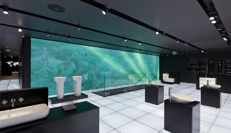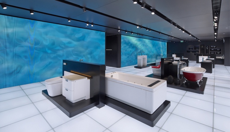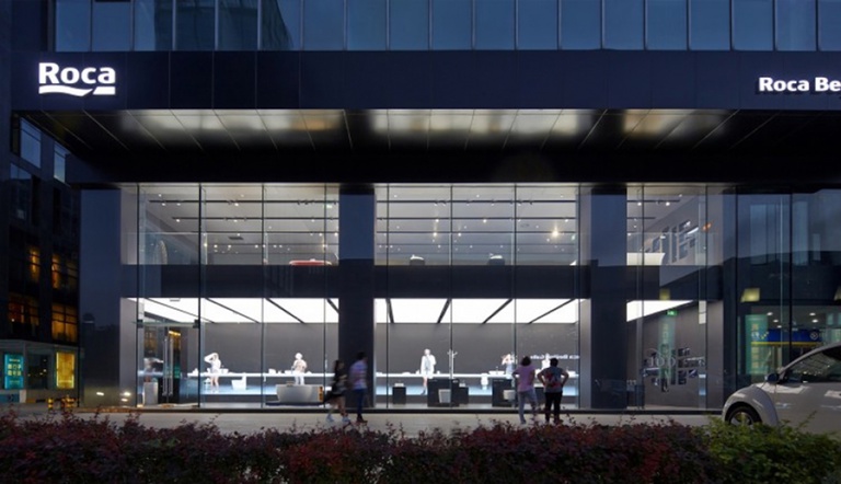 The content of the screens – such as simulated depictions of people using the showrooms – playfully connects the Roca Beijing Gallery’s internal spaces.