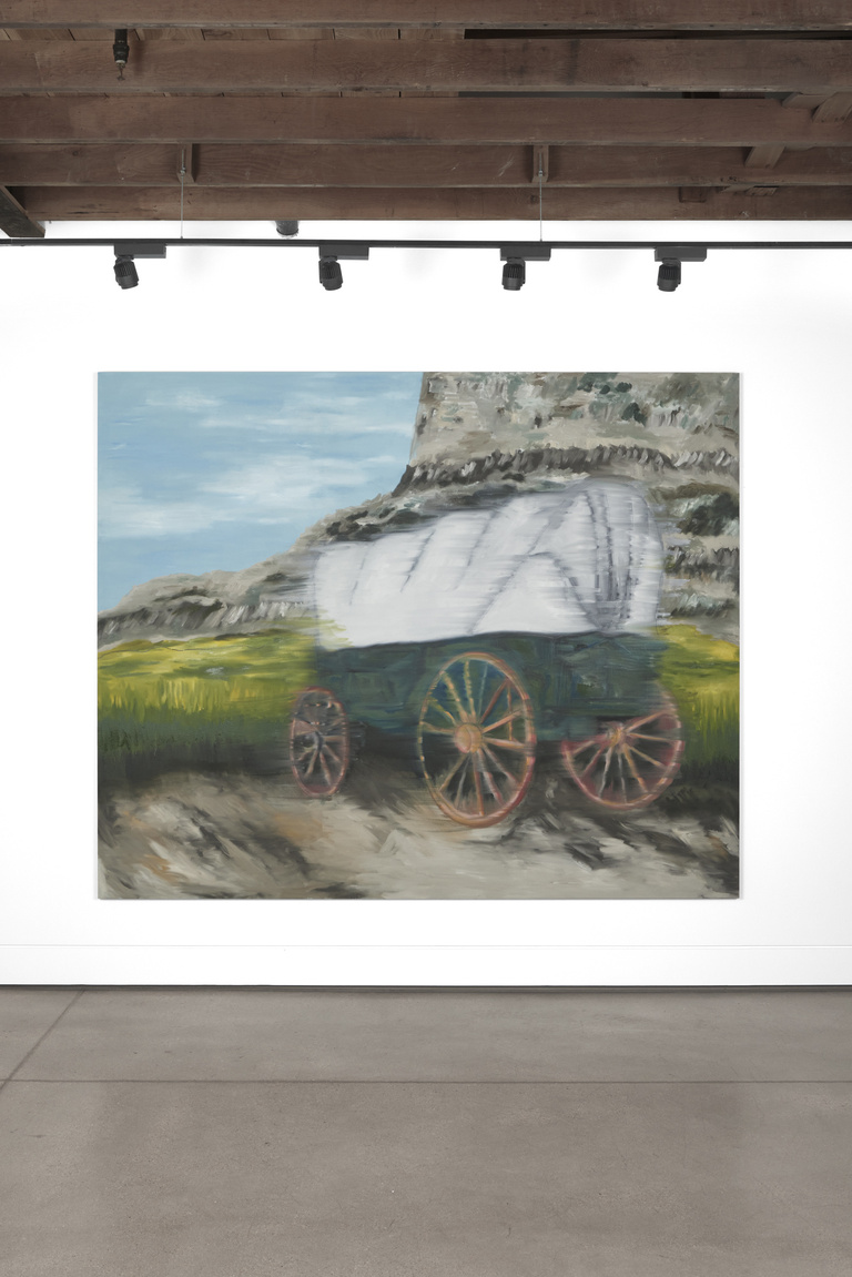 Referring to the Colorado River as a corridor to the West, he engages with a deeply embedded trope in American history and imagination: Manifest Destiny and the westward expansion of pioneers. The title of the exhibition, Rush, echoes one of Simmons’s key references, Charlie Chaplin’s The Gold Rush, and reflects how American mythology has long nurtured ideals of urgency, hope, success, and territorial expansion. It also alludes to the brushstrokes characteristic of Simmons’s work: the rush to erase chalk from blackboards, and metaphorically, to erase histories from collective memory.