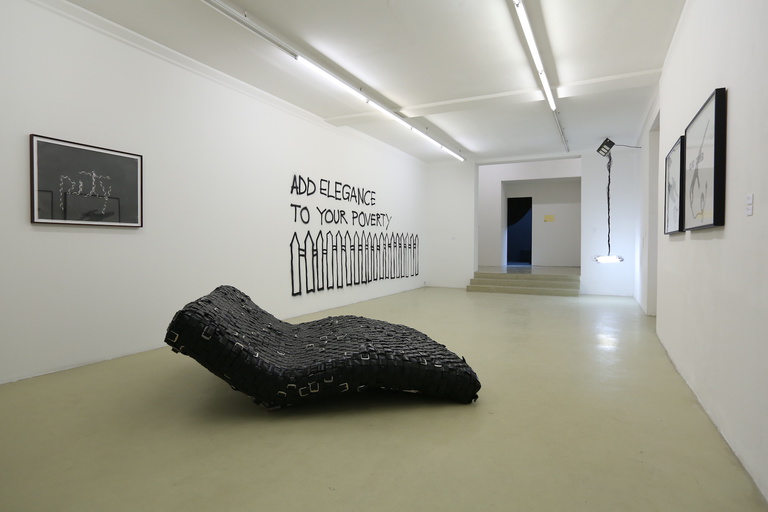 Monica Bonvicini, Pity, 2013, spray on paper, 68 x 89 cm. Belts Couch, 2014, men’s black belts, iron, fabric, 55 x 160 x 200 cm. Courtesy König Galerie, Berlin. Kleine Lichtkanone, 2009, 10 neon tubes and cable ties, 16 x 70 x 12 cm