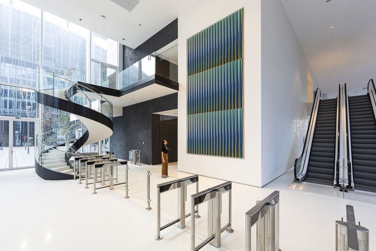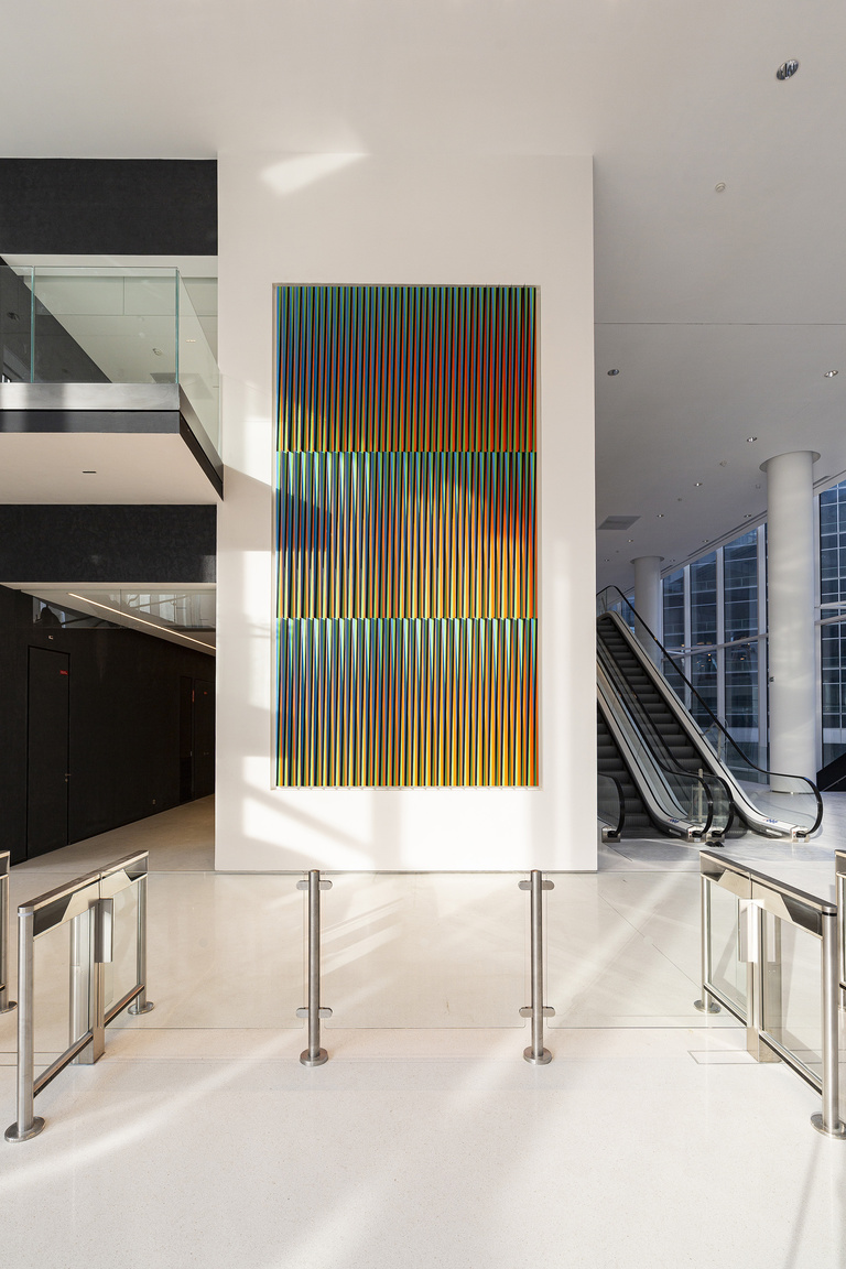 As part of the construction of the Trinity Tower, Trinity Défense and Unibail-Rodamco-Westfield wanted to initiate an artistic commission integrated into the architecture, intended to mark its ambition in terms of contemporary art. Jérôme Sans has been the artistic director of this project and has invited Carlos Cruz-Diez, a prominent figure in kinetic art, to design a work of remarkable size that would respond to the architectural audacity of the project. The work Physichromy modifies itself according to the displacement of the spectator and the intensity of the ambient light, creating unexpected chromatic variations.