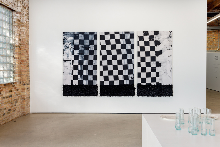 Comme un paysage, une partition musicale ou un carnet sur lequel l'écriture dégouline et détourne le sens, ses trois œuvres textiles Geometry et tales of our desires jouent d'une ambiguïté entre rigidité et liquidité, présence et absence. Une série de 10 dessins éponymes accompagne ces œuvres, comme des esquisses, des échos aux lignes noires grossièrement tracées, presque dansantes. Terrain de tous les possibles met en scène son vocabulaire noir emblématique, tout en démontrant une autre utilisation du textile qui se concentre sur les coupes, les plis et la suggestivité de la matérialité pour transmettre des significations sentimentales. Composé de 200 verres Beldi et de 30 assiettes en céramique contenant chacune un dessin unique de l'artiste, Almost Here, Almost There, Almost Home est produit au Maroc, soulignant la production locale qui mélange l'art et l'artisanat. Combinant le textile, le papier, le verre et la céramique, éléments caractéristiques du langage de l'artiste, les œuvres révèlent un monde de vibrations et d'ambiguïtés, à la fois sensible et poétique.