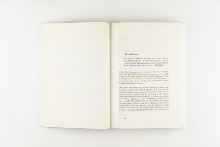 Cet ouvrage réunit un ensemble significatif d'entretiens avec Chen Zhen réalisés entre 1990 et 2000, par certains de ceux qui ont partagé son aventure artistique (Daniel Buren, Hou Hanru, Eleonor Heartney, Emma Lavigne, Ken Lum, Enrico Lunghi, Yves Michaux, Hans-Ulrich Obrist, Jérôme Sans ou Nari Ward) qui, chacun à leur manière, ont développé certains des thèmes essentiels de l'œuvre de l'artiste. Le tout restitue le mouvement de sa pensée et rend compte d'un travail dont les centres multiples offrent sans cesse de nouvelles perspectives.