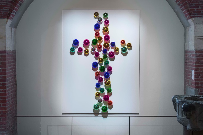 :mentalKLINIK, AMAZE-CROSS, Verre coloré réfléchissant soufflé à la main. 208 x 142 x 19 cm. Golden Room, Eldorado, lille3000Palais des Beaux-Arts, Lille, France, 2019 © photo: Florian Kleinefenn