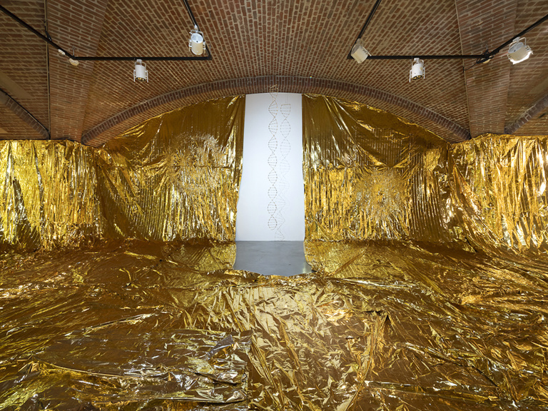 Mircea Cantor, Heaven and Hell Simultaneously, 2016. Couverture de survie. Dimensions variables ; Epic Fountain, 2012, épingles à nourrices en or 24 carat, 314 x 21 cm. Courtesy de l’artiste. Golden Room, Eldorado, lille3000Palais des Beaux-Arts, Lille, France, 2019 © photo: Florian Kleinefenn