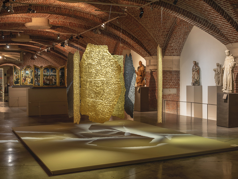 Olga de Amaral, Estela 34, 35, 38, 39, 40, 45, 49, 2007. Lin, gesso, acrylique, feuille d’or. Dimensions variables. Courtesy Galerie Valérie Bach, Bruxelles. Golden Room, Eldorado, lille3000Palais des Beaux-Arts, Lille, France, 2019 © photo: Florian Kleinefenn