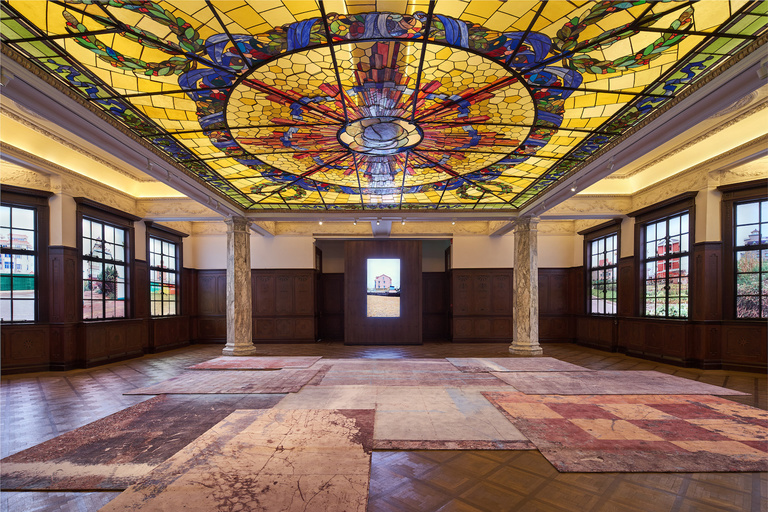 Hangzhou House Series, 2019. Series of sixteen photographs reproduced on stickers. Things you can take away, 2019. Four carpets printed with pictures of patterns of floor tiles commonly used in some houses, dimensions variable. Li Qing, Rear Windows, Prada Rong Zhai, Shanghai, 2019 © photo: Zhuhai