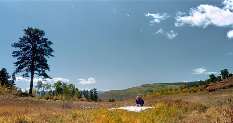 Nomade dans sa pratique, l’artiste travaille en extérieur, avec la nature pour atelier. Pour son projet à Cookie Factory, Sam Falls se saisit de l'immensité de la région du Colorado, célèbre pour sa diversité, allant des montagnes, des canyons, des plaines rêches, aux déserts arides. Il a particulièrement travaillé dans la vallée de la rivière Yampa, entouré par la majestueuse chaîne de montagnes Gore. En se focalisant sur ce territoire, plus précisément sur le chemin du légendaire Pony Express – le service de livraison rapide de courrier aux États-Unis, actif de 1860 à 1861 – le travail de l’artiste évoque une histoire américaine spécifique et un chapitre important de l’histoire du pays. Comme un hommage au Far West et aux Amérindiens qui ont protégé cette terre, Sam Falls revient aux racines, à l’âme de cette région ainsi qu’à son histoire complexe. Profondément ancrées dans le lieu de leur création, ses toiles et ses œuvres sculpturales sont comme des documents géographiques, une empreinte territoriale.