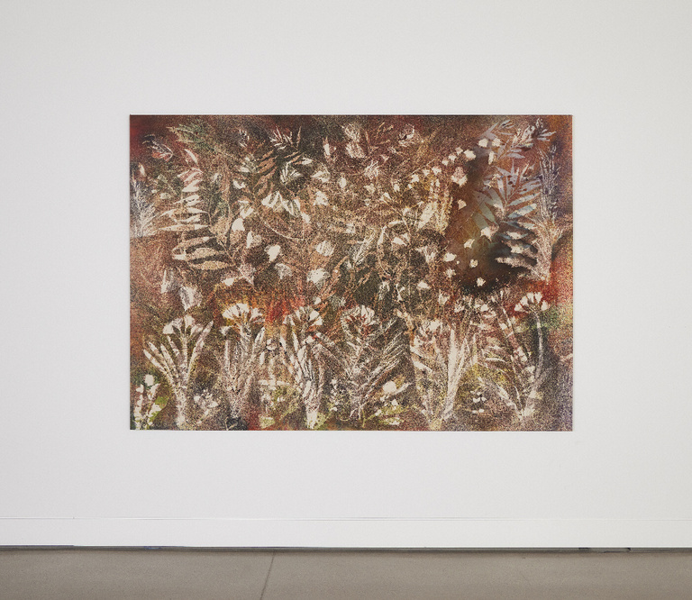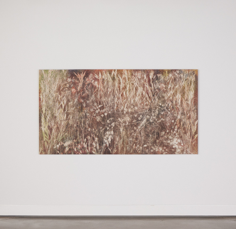 Connu pour intégrer la nature dans son processus créatif, Sam Falls saupoudre de pigment la végétation sélectionnée et laisse ses toiles évoluer face à l’humidité atmosphérique, au soleil et à la pluie. Ainsi, Sam Falls travaille dans un studio sans mur : la nature est son laboratoire et lui dicte le rythme de création de ses œuvres. À l’instar du four pour les céramistes, sa méthode impose de ne jamais connaître la forme finale à l’avance, mais de toujours embrasser les forces imprévisibles de l’environnement. C’est aussi admettre le risque et accepter que le processus puisse ne pas fonctionner. L’artiste opère un renversement : ce n’est plus nous qui regardons la nature, mais la nature qui nous regarde ; ce n’est plus l’humanité qui apprivoise la nature, mais la nature qui apprivoise l’Homme. Le processus de la nature est respecté, une osmose avec l’espace et le temps météorologique est créée. Les toiles de Sam Falls racontent l’histoire de cette acceptation. L’artiste n’est plus l’acteur central de la narration : c'est la nature qui occupe le devant de la scène, c'est sa voix qui se fait entendre. Complètement négligée et oubliée par le monde post-industriel, ici, la nature retrouve en quelque sorte sa place légitime.