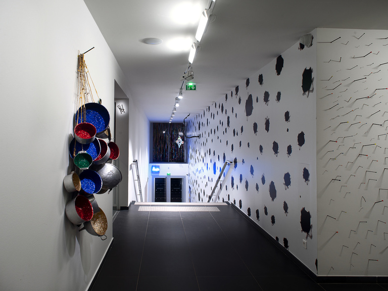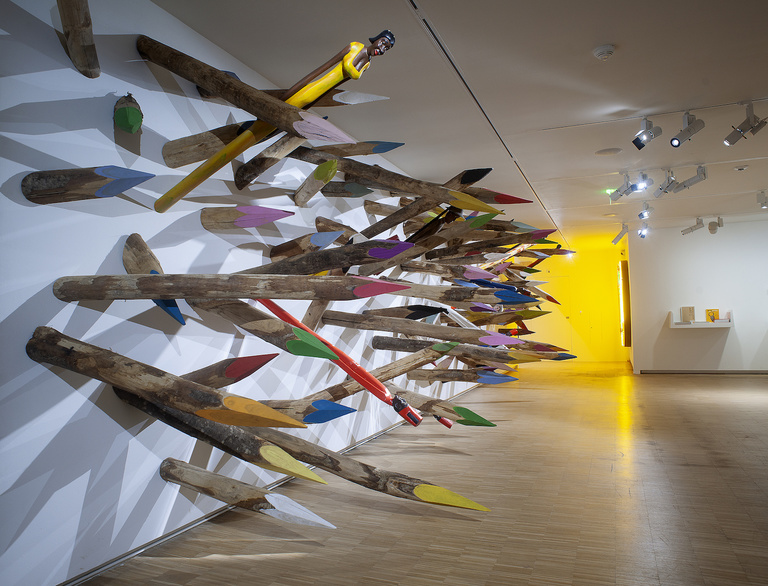 Black Forest s’envisage comme une traversée vers des territoires inconnus et ouverts, « une promenade in situ au cœur des pistes de nos doutes existentiels », « un moment d’interrogations sur l’imaginaire du grand monde et son contenu ». Telle une introspective, elle déploie tout le vocabulaire aux écritures multiples et délibérément mobile de l’artiste, suspendu entre le récit onirique du quotidien et la nécessité d’hybrider des situations, des particularités humaines et des géographies. Près d’une centaine d’œuvres, des pièces iconiques et de nouvelles productions, forme un cheminement au cours duquel l’artiste touche aux points cardinaux de la société contemporaine ainsi qu’aux thèmes du village global, du voyage, de l’identité culturelle, de la mondialisation, de la perméabilité des frontières, de l’écologie et de la ritualisation contemporaine. Passant naturellement de la sculpture, au dessin, à la peinture, à l’installation et à la poésie, cette ballade colorée et ludique est rythmée en trois temps, depuis la salle carrée, « le tronc » de l’exposition jusqu’à l’ancienne cuverie « la Forêt » qui offrira une expérience ritualisée rythmée de bruits d’oiseaux, avant de finir par la nef pour retrouver les « cimes ». Par ce bouleversement de l’ordre des choses, Pascale Marthine Tayou propose un autre regard sur le quotidien sous une apparente désinvolture esthétique. Des récits fictionnels et des rituels se chevauchent et s’emmêlent dans une cacophonie heureuse qui célèbre cette nouvelle poésie de l’humain… Black Forestse vie comme une expérience totale, offerte simultanément à la vue, l’ouïe, l’odorat, qui confronte le visiteur au choc des cultures et l’invite à s’engager dans la réalité en perpétuelle mutation du monde dans lequel il vit. Ce voyage initiatique au cœur des mystères de la forêt noire devient une condition psychologique qui nous invite à croiser nos peurs, nos joies, nos indécisions et nos inquiétudes, et à nous prendre par la main pour inventer un nouveau rituel qui réduirait les frontières qui nous séparent et dirait l’envie de découvrir l’autre.