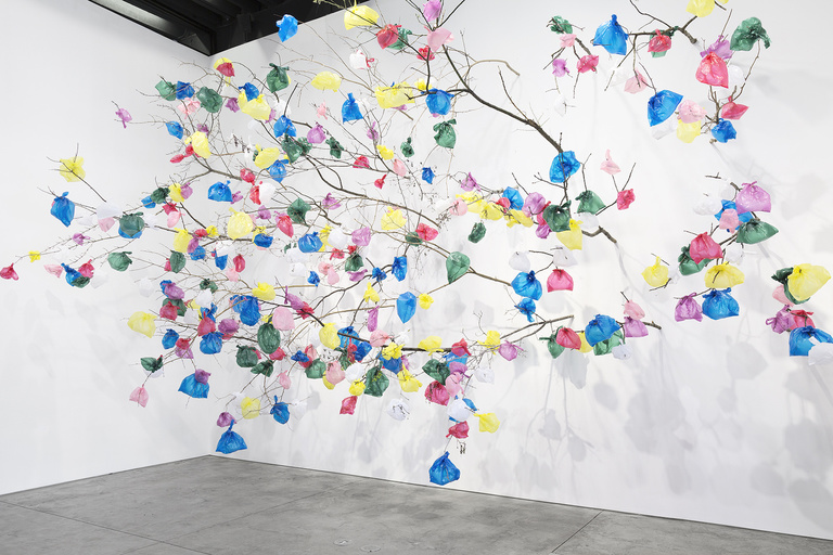 Pascale Marthine Tayou, Plastic Tree, 2014-2018. Branches, plastic bags, variable dimensions, unique work. Exhibition view: Colorful Line, 2018 © Richard Taittinger Gallery, New York © Photo: Shark Senesac