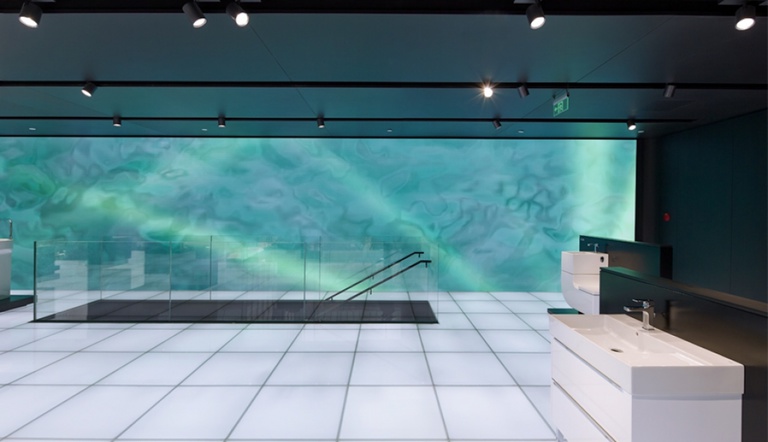 La galerie Roca Beijing par MAD Architects est un projet consistant en un espace de galerie dégagé qui s'ouvre sur l’environnement urbain. Derrière un vitrage à double hauteur, les murs intérieurs des deux étages de la galerie, recouverts d'un écran de LED, deviennent une nouvelle façade pour la ville.