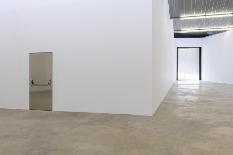 Cette série de peintures emblématiques est associée à un autre élément emblématique du vocabulaire de Brüggemann : les portes en acier inoxydable, situées à la fois à l'intérieur et à l'extérieur de la Fondation. Dans l'espace d'exposition, une porte évoque la sortie de secours d'une galerie ou d'un musée. Métaphore d'un autre monde, d'une autre dimension, cette pièce devient aussi ici symbole de mystère, jouant avec l'inconnu de ce qui se cache derrière et l'ambiguïté de son statut d'œuvre d'art. En plaçant simplement cette porte à sa place habituelle et vraisemblable, l'artiste joue avec la notion de ready-made, flirtant avec la frontière entre réalité et fiction. Le matériau et son effet miroir évoquent également la notion de spéculation dans la réalité. Reflétant le spectateur, la porte devient une question existentielle : "L'œuvre vous rappelle toujours que vous êtes libre, mais que vous n'êtes pas libre de vous-même. C'est un piège. »