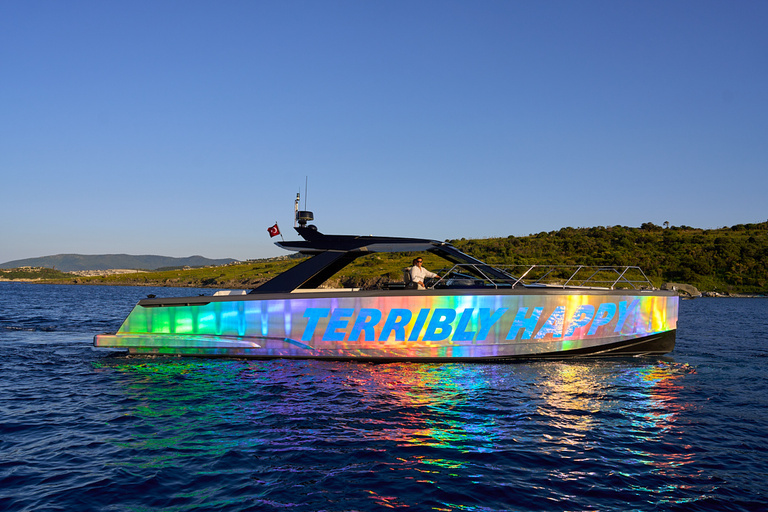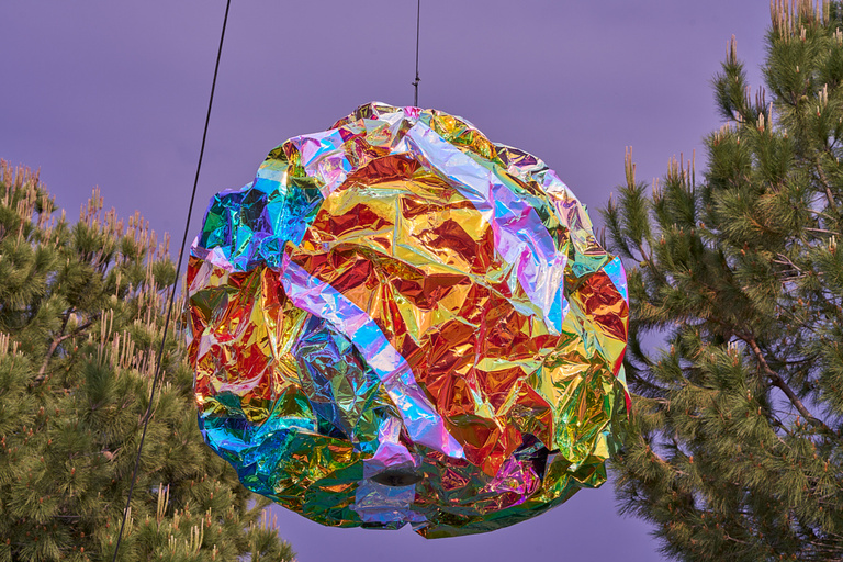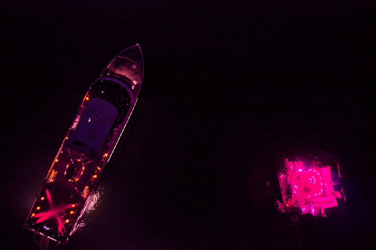 Dès l’arrivée commence le premier acte de la scène : un bateau devient œuvre d’art scintillante, flottant comme par magie sur l’eau, enveloppé d’une membrane réfléchissante qui absorbe et reflète les hyper-couleurs environnantes. Transformé par :mentalKLINIK en sculpture dérivante, ce bateau émane de la joie sur la mer tout en restant singulièrement étranger à son environnement, posant subtilement la question de la complexité et de la nécessité du bonheur aujourd’hui.