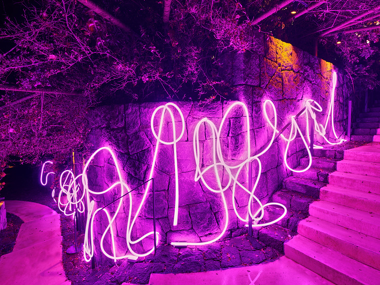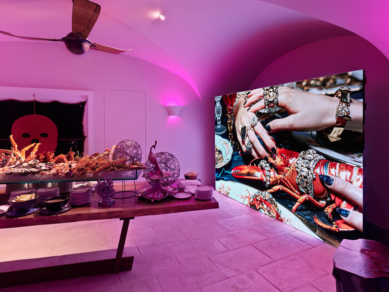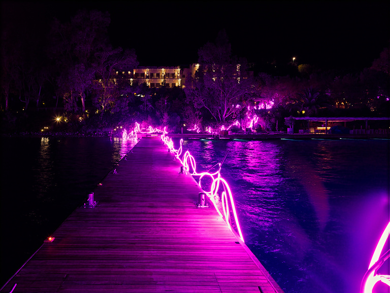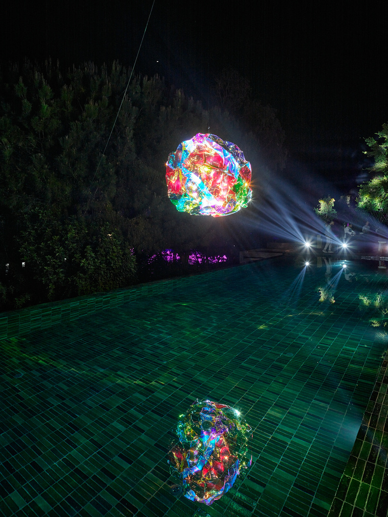 À la Villa Maçakızı, les visiteurs entrent ensuite dans un environnement scénographié par la lumière, les reflets et l’image. Des œuvres telles que Frivolous, Another Love et Elsewhere Is Paradise nous emmènent dans des couches superposées de lumière et de mirage, tandis que Dirty Dance, une boule disco réfléchissante ressemblant à une météorite, projette une chorégraphie de fragments de lumière sur la piscine. Les vidéos /IMAGINE et Night Whiff habitent l’espace comme des hallucinations numériques — à la fois séduisantes et troublantes, oscillant entre l'hyper réel et le poétique.