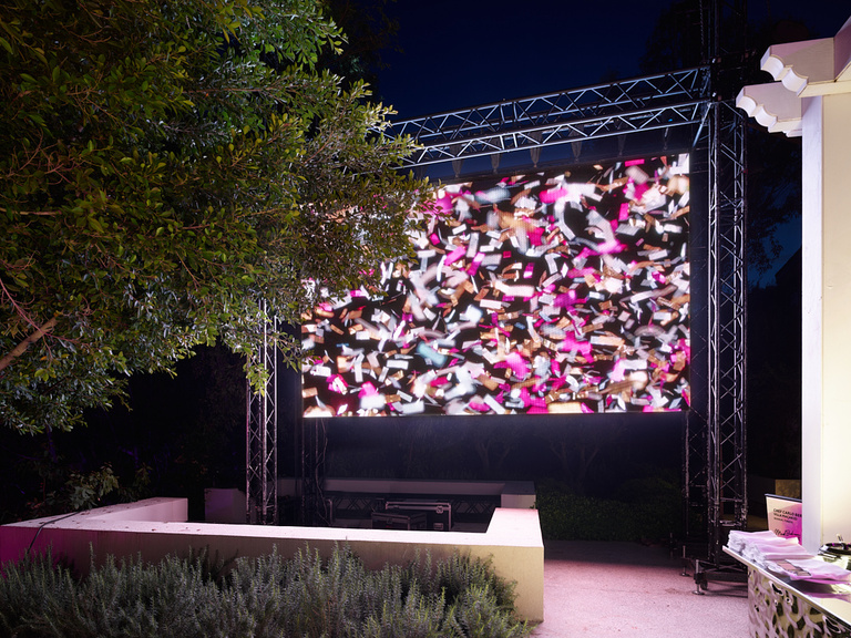 Projetée sur les pierres antiques, Violently Joyful transforme le langage en lumière, des mots comme Like, Follow, Comment clignotent et évoquent dans un agitement frénétique, nos compulsions sociales. Ces ruines deviennent alors la scène pour le rythme sourd de ce monde numérique. Dans la vidéo Hypercloud, les motifs colorés et abstraits, mis en mouvement au ralentis, étirent notre perception dans une boucle méditative sur le temps, l’espace et l’attention.