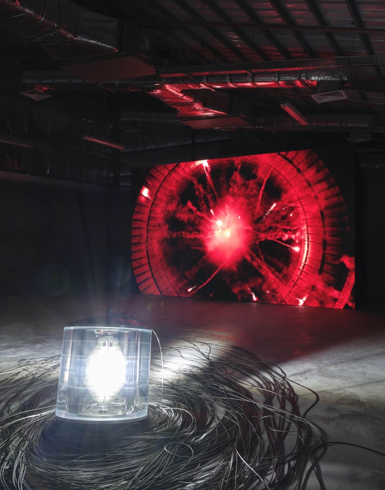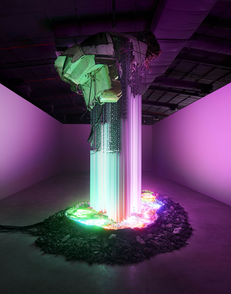 Aircraft wreckage, fluorescent light tubes, Tesla coils, vintage neon signs, chains, crushed concrete, mixed media fiberglass pond, microcontroller
