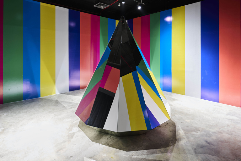 Steel sculpture with fluorescent lacquer, transducer sound beam, meteorite, UV, and laser elements